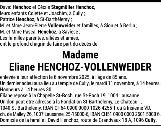 Madame Eliane Henchoz-Vollenweider 12 jan. 1940 - 06 nov. 2025 Avis mortuaire PFG Partager sur: Galerie
