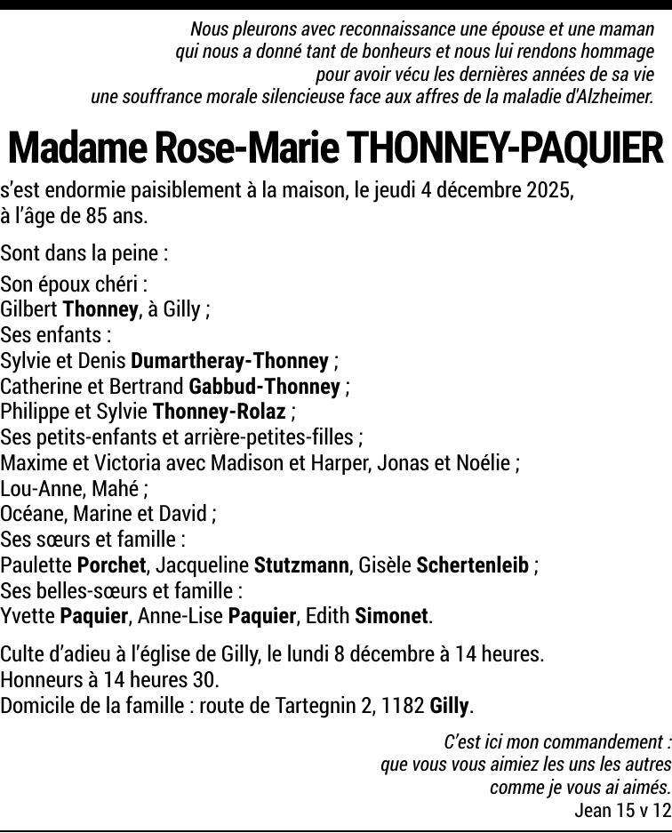 Madame Rose-Marie THONNEY-PAQUIER 11 avr. 1940 - 04 déc. 2025 Avis mortuaire PFG Partager sur: Galerie