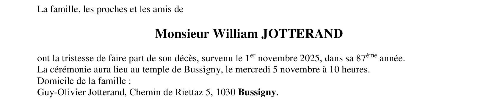 Monsieur William JOTTERAND 21 jan. 1939 - 01 nov. 2025 Avis mortuaire PFG Partager sur: Galerie PreviousNext PreviousNext