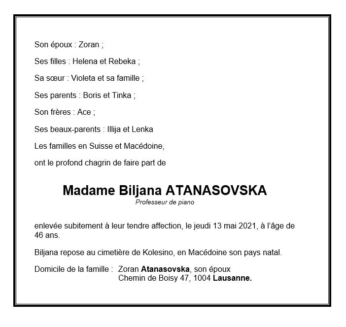 Biljana ATANASOVSKA 15 avr. 1975 - 13 mai. 2021 Avis mortuaire PFG Télecharger PDF Partager sur: Galerie PreviousNext PreviousNext