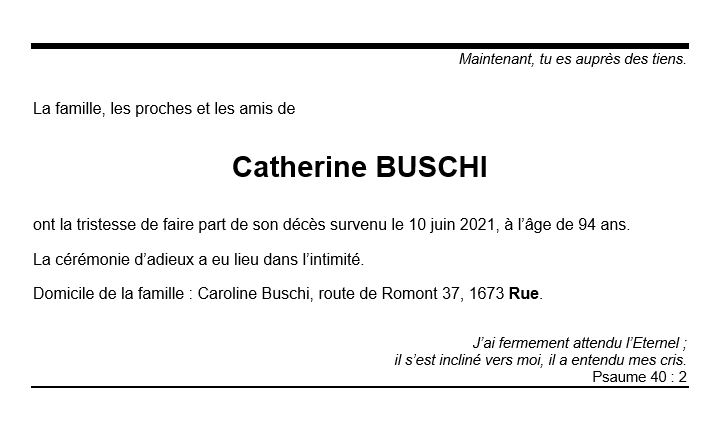 Catherine BUSCHI 31 oct. 1926 - 10 juin. 2021 Avis mortuaire PFG Télecharger PDF Partager sur: Galerie PreviousNext PreviousNext