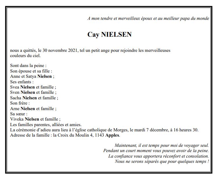 Cay NIELSEN 06 mar. 1949 - 30 nov. 2021 Avis mortuaire PFG Télecharger PDF Partager sur: Galerie PreviousNext PreviousNext