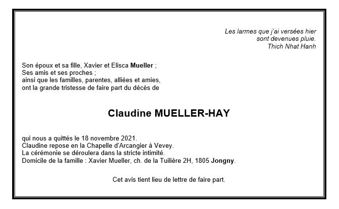 Claudine MUELLER-HAY 01 avr. 1955 - 18 nov. 2021 Avis mortuaire PFG Télecharger PDF Partager sur: Galerie PreviousNext PreviousNext
