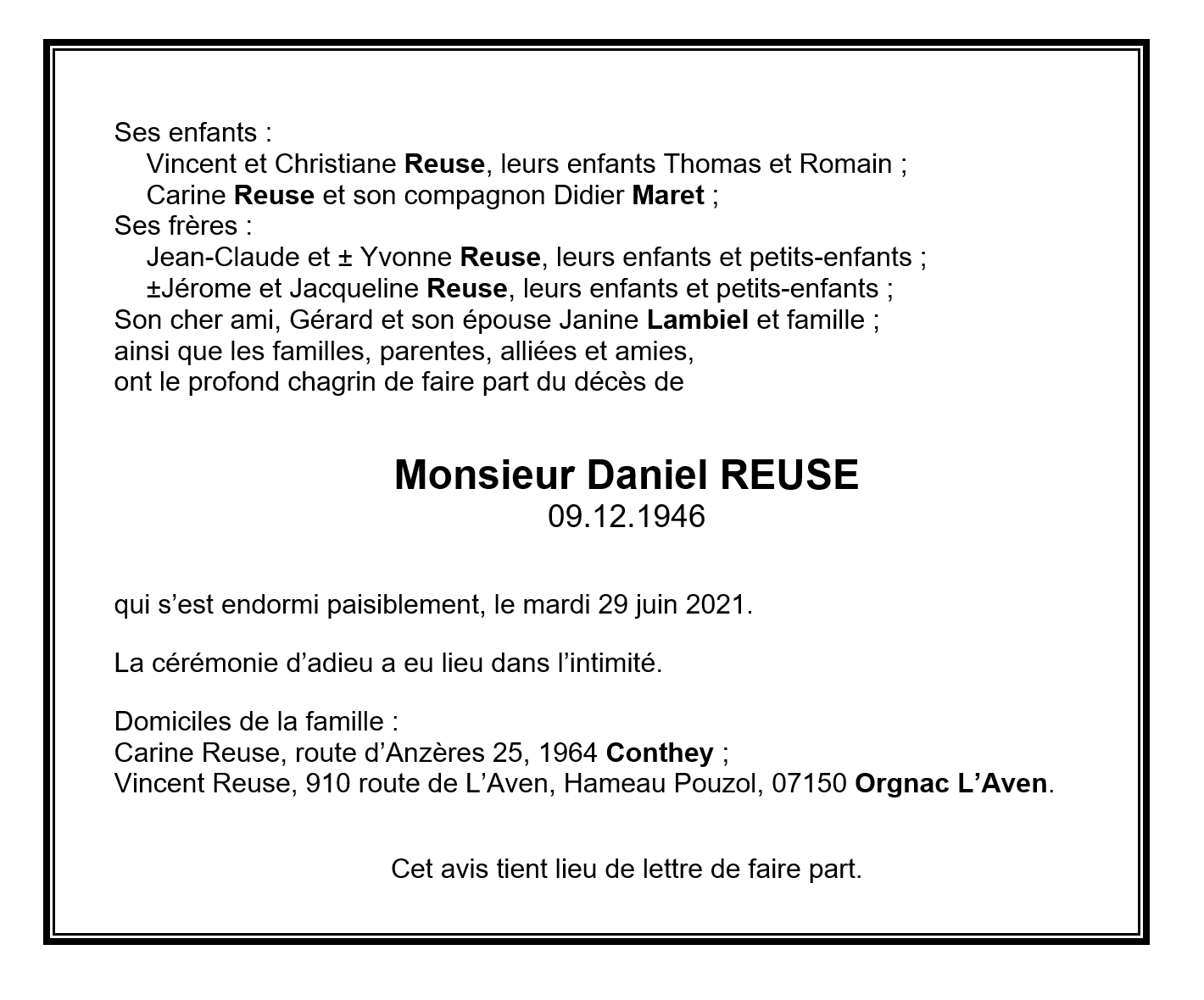 Daniel REUSE 09 déc. 1946 - 29 juin. 2021 Avis mortuaire PFG Télecharger PDF Partager sur: Galerie PreviousNext PreviousNext