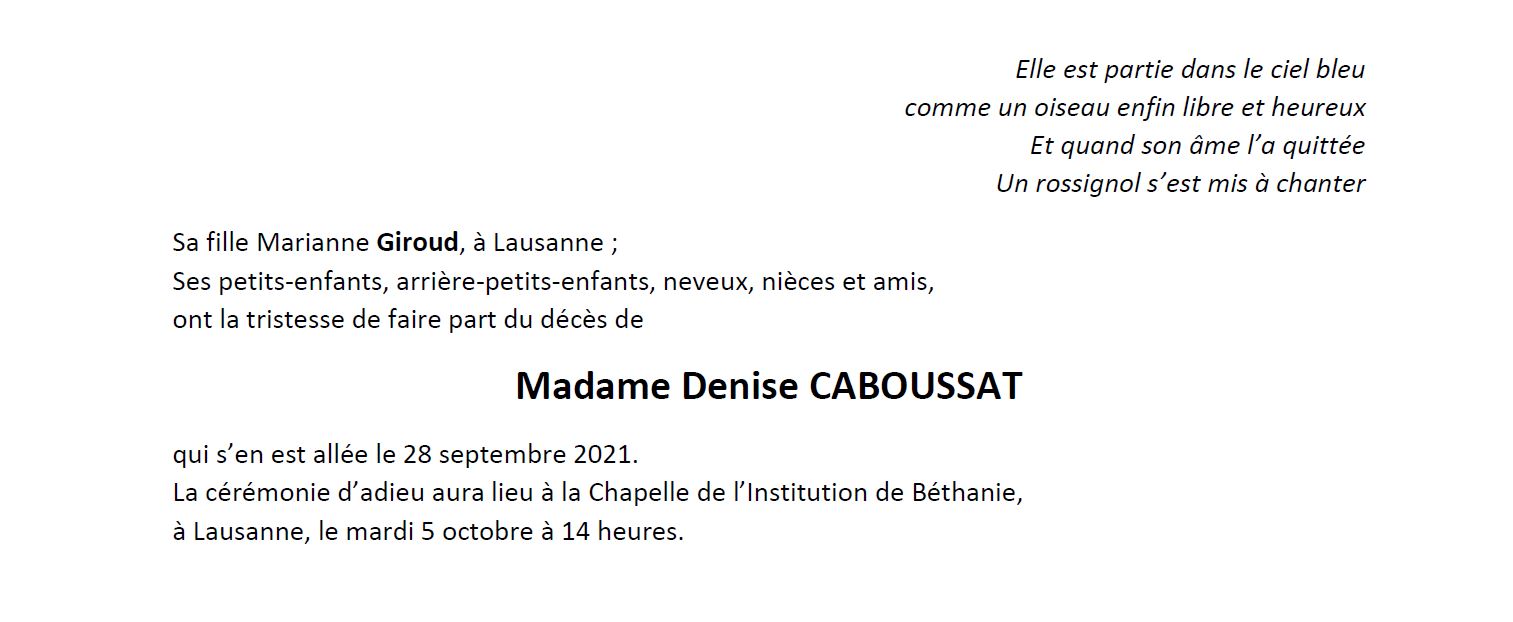 Denise CABOUSSAT 21 déc. 1921 - 28 sep. 2021 Avis mortuaire PFG Télecharger PDF Partager sur: Galerie PreviousNext PreviousNext