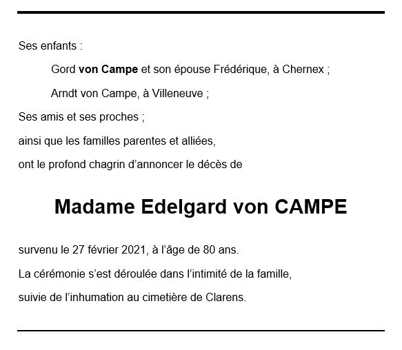 Edelgard von CAMPE 24 oct. 1940 - 27 fév. 2021 Avis mortuaire PFG Télecharger PDF Partager sur: Galerie PreviousNext PreviousNext