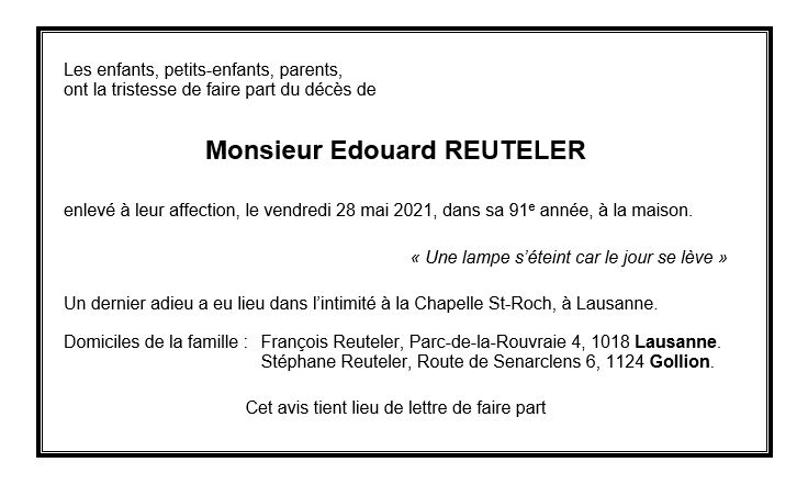 Edouard REUTELER 17 sep. 1930 - 28 mai. 2021 Avis mortuaire PFG Télecharger PDF Partager sur: Galerie PreviousNext PreviousNext