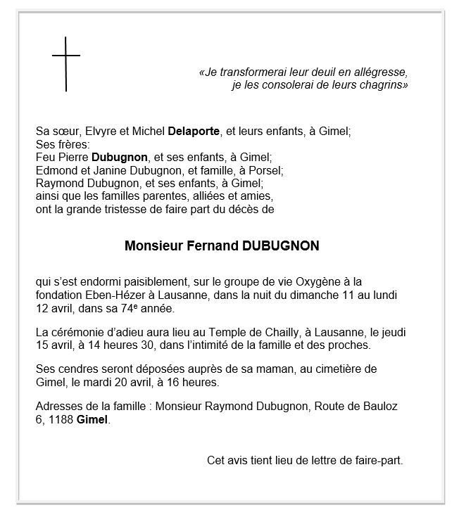 Fernand DUBUGNON 07 déc. 1947 - 12 avr. 2021 Avis mortuaire PFG Télecharger PDF Partager sur: Galerie PreviousNext PreviousNext