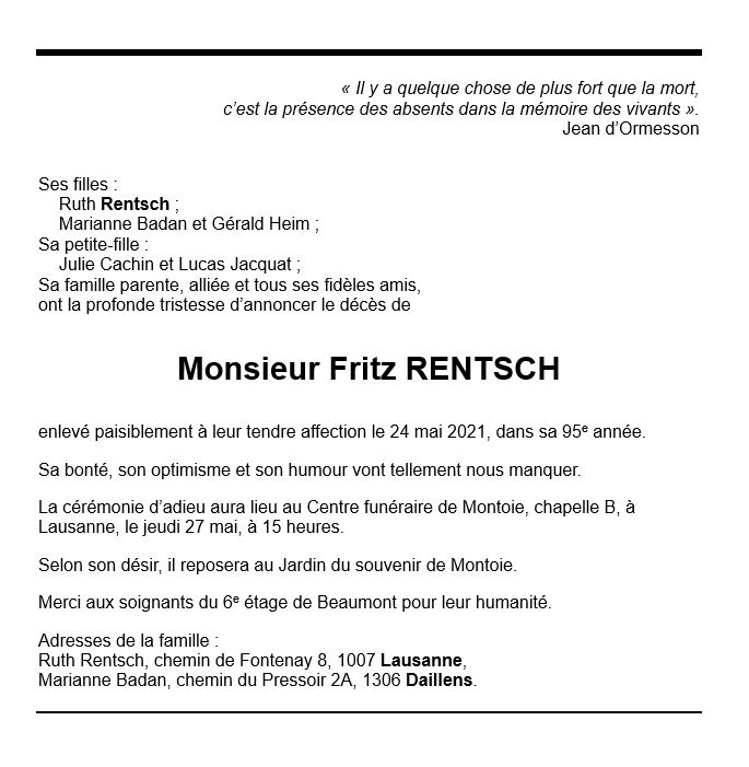 Fritz RENTSCH 27 sep. 1926 - 24 mai. 2021 Avis mortuaire PFG Télecharger PDF Partager sur: Galerie PreviousNext PreviousNext