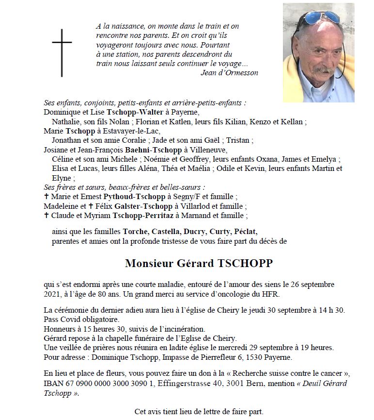 Gérard TSCHOPP 22 fév. 1941 - 26 sep. 2021 Avis mortuaire PFG Télecharger PDF Partager sur: Galerie PreviousNext PreviousNext