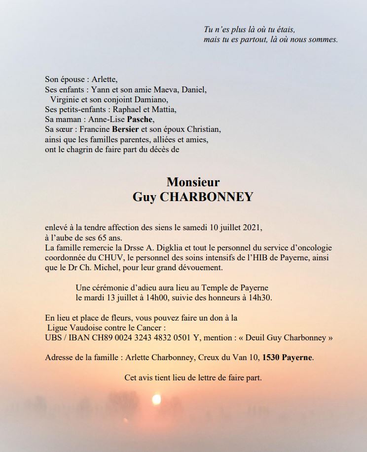 Guy CHARBONNEY 13 aoû. 1956 - 10 juil. 2021 Avis mortuaire PFG Télecharger PDF Partager sur: Galerie PreviousNext PreviousNext