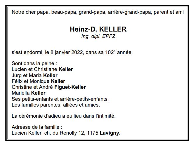 Heinz-D. KELLER 30 déc. 1920 - 08 jan. 2022 Avis mortuaire PFG Télecharger PDF Partager sur: Galerie PreviousNext PreviousNext