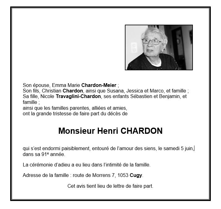 Henri CHARDON 10 juil. 1930 - 05 juin. 2021 Avis mortuaire PFG Télecharger PDF Partager sur: Galerie PreviousNext PreviousNext