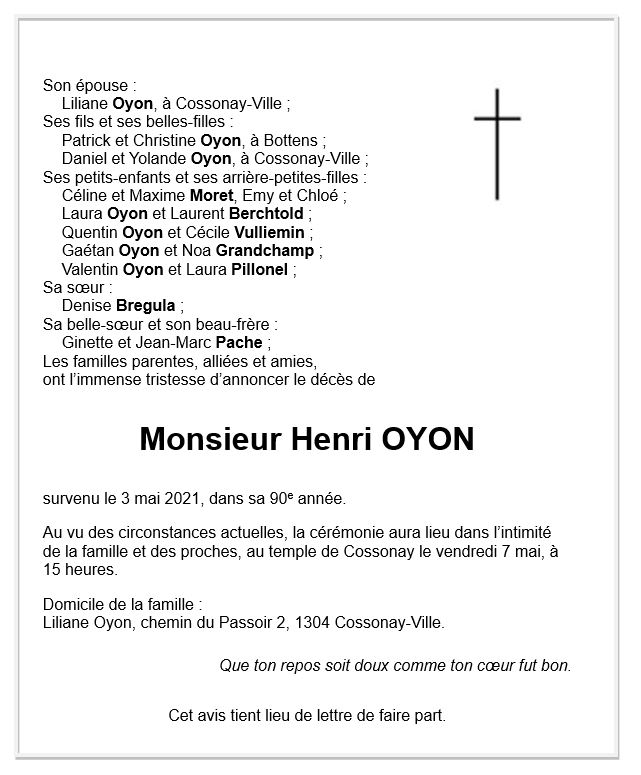 Henri OYON 05 déc. 1931 - 03 mai. 2021 Avis mortuaire PFG Télecharger PDF Partager sur: Galerie PreviousNext PreviousNext