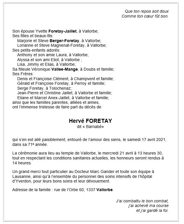 Hervé FORETAY 17 avr. 2021 Avis mortuaire PFG Télecharger PDF Partager sur: Galerie PreviousNext PreviousNext