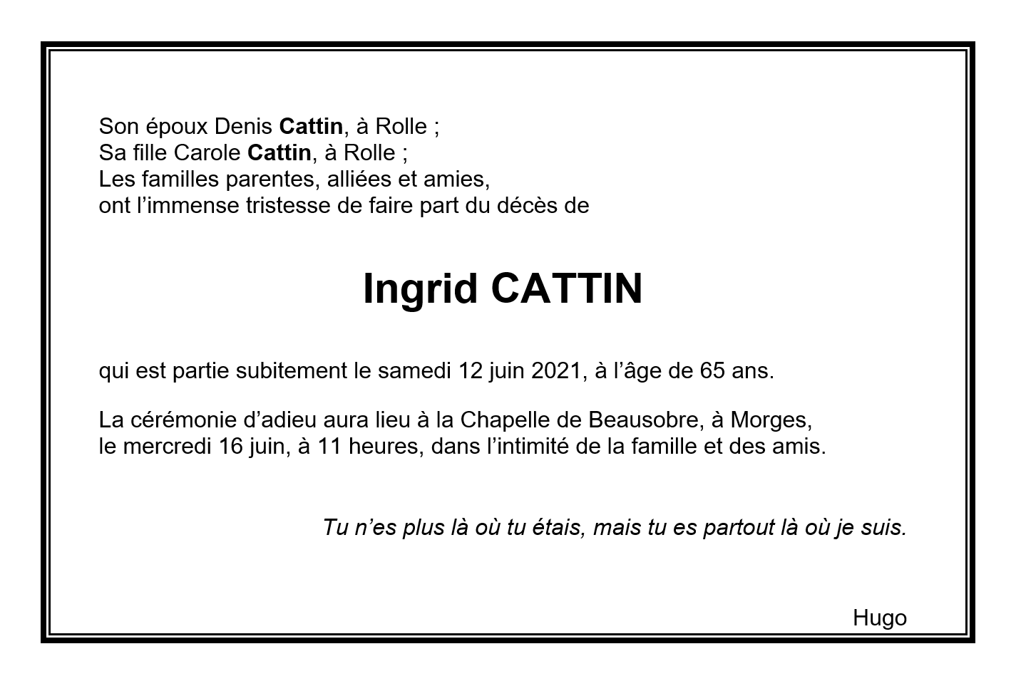 Ingrid CATTIN 09 déc. 1955 - 12 juin. 2021 Avis mortuaire PFG Télecharger PDF Partager sur: Galerie PreviousNext PreviousNext