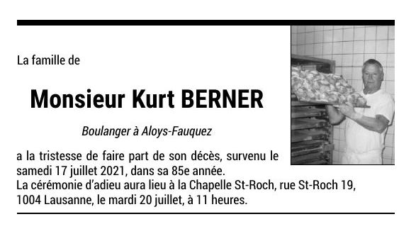 Kurt BERNER 19 nov. 1936 - 17 juil. 2021 Avis mortuaire PFG Télecharger PDF Partager sur: Galerie PreviousNext PreviousNext