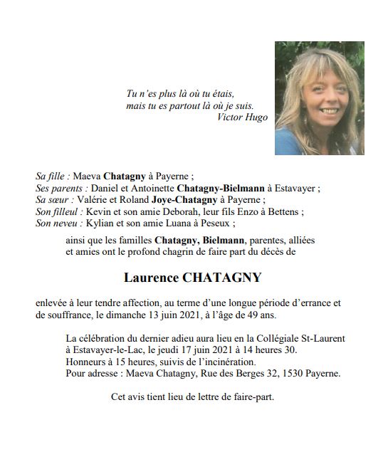 Laurence CHATAGNY 05 juin. 1972 - 13 juin. 2021 Avis mortuaire PFG Télecharger PDF Partager sur: Galerie PreviousNext PreviousNext