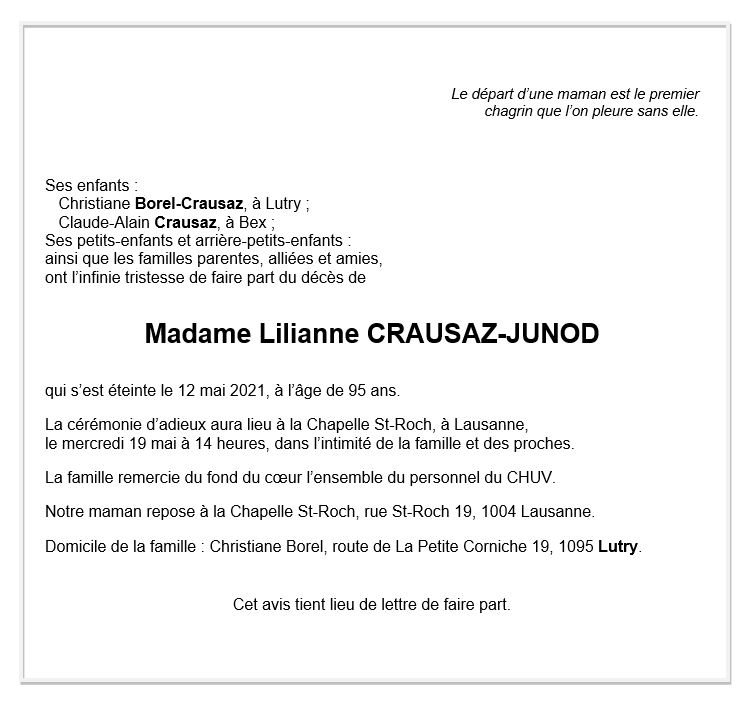 Lilianne CRAUSAZ-JUNOD 04 avr. 1926 - 12 mai. 2021 Avis mortuaire PFG Télecharger PDF Partager sur: Galerie PreviousNext PreviousNext