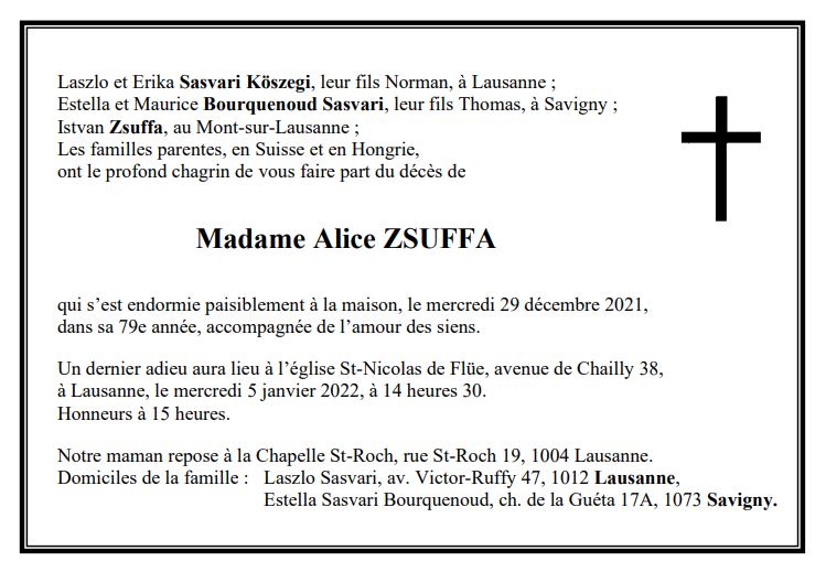 Madame Alice ZSUFFA 07 avr. 1943 - 29 déc. 2021 Avis mortuaire PFG Télecharger PDF Partager sur: Galerie PreviousNext PreviousNext