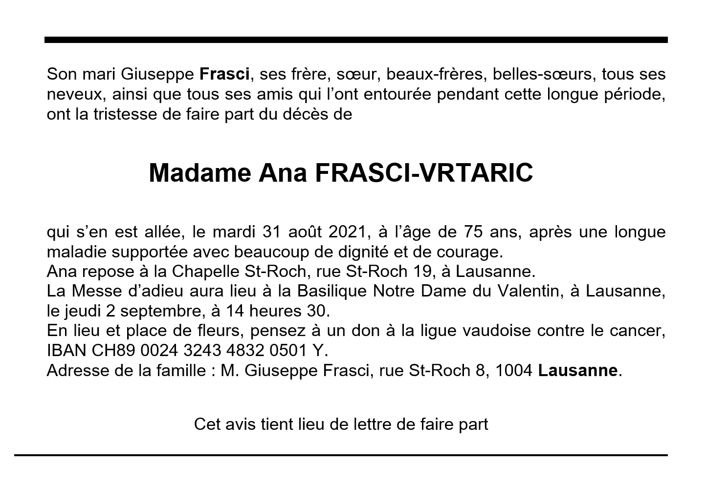 Madame Ana FRASCI-VRTARIC 21 juin. 1946 - 31 aoû. 2021 Avis mortuaire PFG Télecharger PDF Partager sur: Galerie PreviousNext PreviousNext