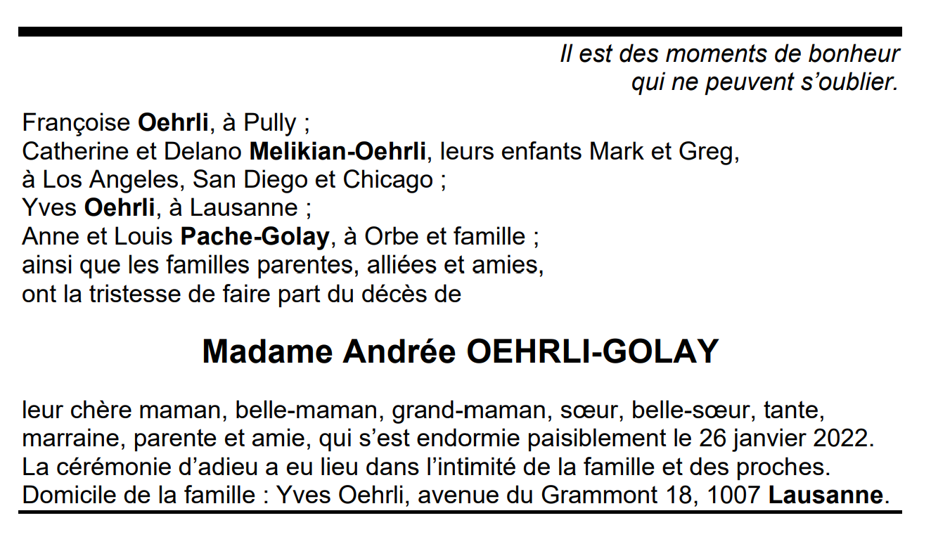 Madame Andrée OEHRLI-GOLAY 16 juin. 1935 - 26 jan. 2022 Avis mortuaire PFG Télecharger PDF Partager sur: Galerie PreviousNext PreviousNext
