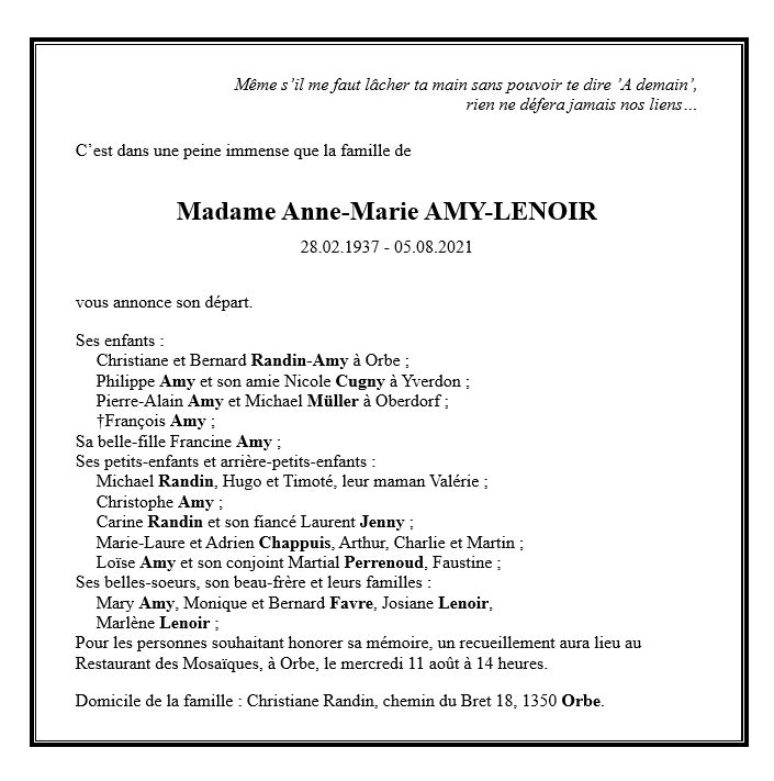 Madame Anne-Marie AMY-LENOIR 28 fév. 1937 - 05 aoû. 2021 Avis mortuaire PFG Télecharger PDF Partager sur: Galerie PreviousNext PreviousNext