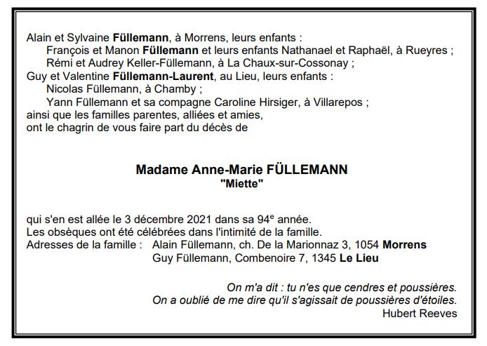 Madame Anne-Marie FÜLLEMANN 19 avr. 1958 - 03 déc. 2021 Avis mortuaire PFG Télecharger PDF Partager sur: Galerie PreviousNext PreviousNext