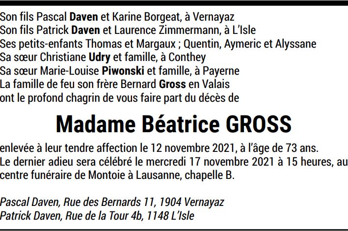 Madame Béatrice GROSS 24 juin. 1948 - 12 nov. 2021 Avis mortuaire PFG Télecharger PDF Partager sur: Galerie PreviousNext PreviousNext
