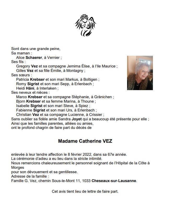 Madame Catherine VEZ 02 fév. 1955 - 08 fév. 2022 Avis mortuaire PFG Télecharger PDF Partager sur: Galerie PreviousNext PreviousNext