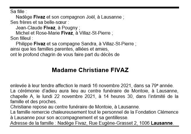 Madame Christiane FIVAZ 14 avr. 1943 - 16 nov. 2021 Avis mortuaire PFG Télecharger PDF Partager sur: Galerie PreviousNext PreviousNext