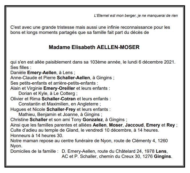 Madame Elisabeth AELLEN-MOSER 04 sep. 1919 - 06 déc. 2021 Avis mortuaire PFG Télecharger PDF Partager sur: Galerie PreviousNext PreviousNext