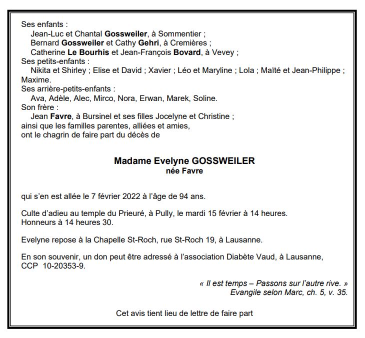 Madame Evelyne GOSSWEILER 11 oct. 1927 - 07 fév. 2022 Avis mortuaire PFG Télecharger PDF Partager sur: Galerie PreviousNext PreviousNext