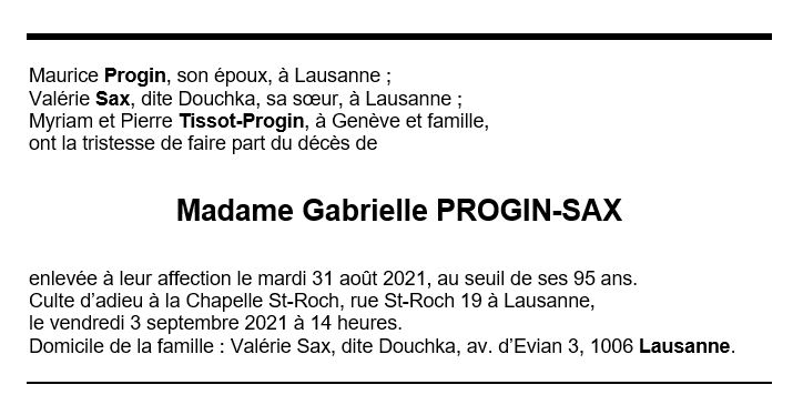 Madame Gabrielle PROGIN-SAX 13 sep. 1926 - 31 aoû. 2021 Avis mortuaire PFG Télecharger PDF Partager sur: Galerie PreviousNext PreviousNext