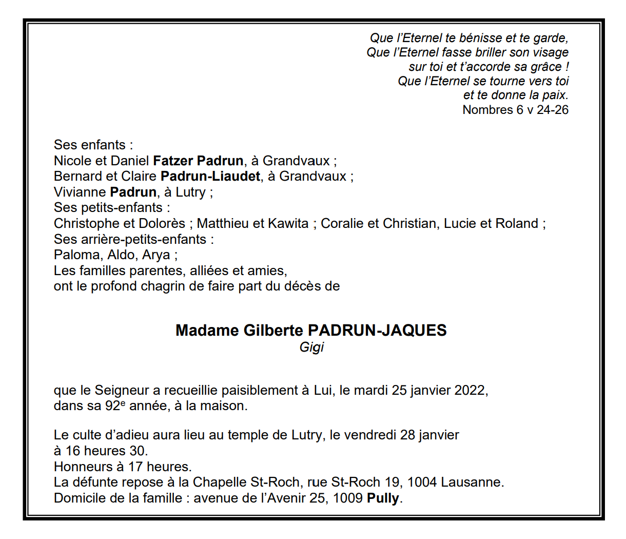Madame Gilberte PADRUN-JAQUES 03 nov. 1930 - 25 jan. 2022 Avis mortuaire PFG Télecharger PDF Partager sur: Galerie PreviousNext PreviousNext