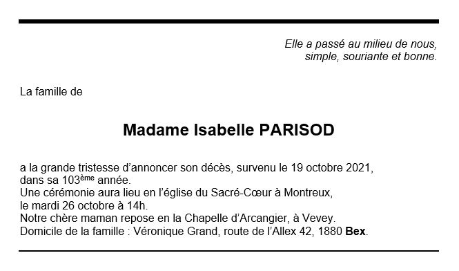 Madame Isabelle PARISOD 13 jan. 1919 - 19 oct. 2021 Avis mortuaire PFG Télecharger PDF Partager sur: Galerie PreviousNext PreviousNext