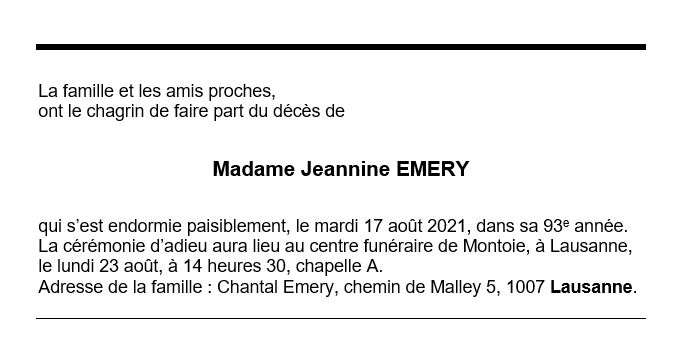 Madame Jeannine EMERY 11 mar. 1929 - 17 aoû. 2021 Avis mortuaire PFG Télecharger PDF Partager sur: Galerie PreviousNext PreviousNext