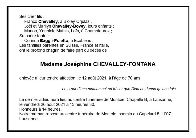Madame Joséphine CHEVALLEY-FONTANA 10 avr. 1945 - 12 aoû. 2021 Avis mortuaire PFG Télecharger PDF Partager sur: Galerie PreviousNext PreviousNext