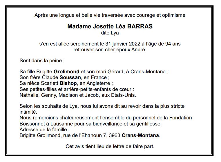 Madame Josette Léa BARRAS 29 sep. 1927 - 31 jan. 2022 Avis mortuaire PFG Télecharger PDF Partager sur: Galerie PreviousNext PreviousNext
