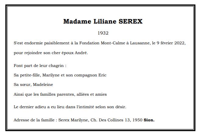 Madame Liliane SEREX 10 avr. 1932 - 09 fév. 2022 Avis mortuaire PFG Télecharger PDF Partager sur: Galerie PreviousNext PreviousNext