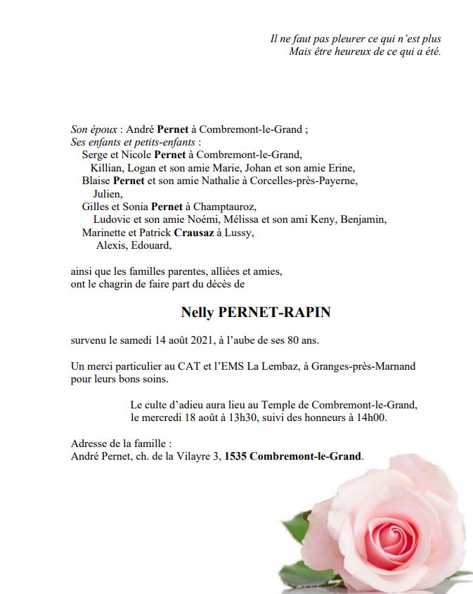 Madame Nelly PERNET-RAPIN 08 nov. 1941 - 14 aoû. 2021 Avis mortuaire PFG Télecharger PDF Partager sur: Galerie PreviousNext PreviousNext