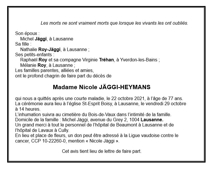 Madame Nicole JÄGGI-HEYMANS 21 sep. 1944 - 22 oct. 2021 Avis mortuaire PFG Télecharger PDF Partager sur: Galerie PreviousNext PreviousNext