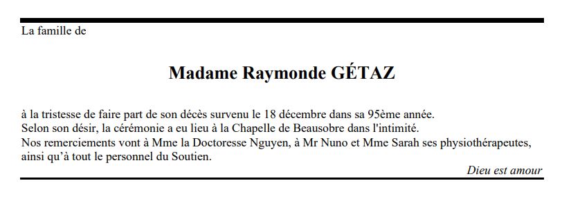 Madame Raymonde GÉTAZ 13 juin. 1927 - 18 déc. 2021 Avis mortuaire PFG Télecharger PDF Partager sur: Galerie PreviousNext PreviousNext