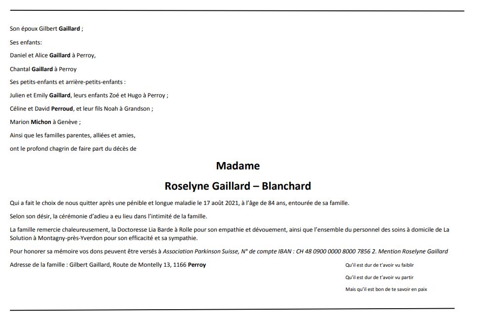 Madame Roselyne GAILLARD-BLANCHARD 28 oct. 1937 - 17 aoû. 2021 Avis mortuaire PFG Télecharger PDF Partager sur: Galerie PreviousNext PreviousNext