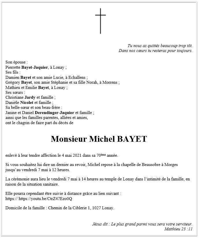 Michel BAYET 16 aoû. 1951 - 04 mai. 2021 Avis mortuaire PFG Télecharger PDF Partager sur: Galerie PreviousNext PreviousNext