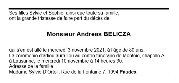 Monsieur Andreas BELICZA 18 juin. 1941 - 03 nov. 2021 Avis mortuaire PFG Télecharger PDF Partager sur: Galerie PreviousNext PreviousNext