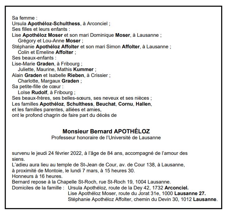 Monsieur Bernard APOTHÉLOZ 19 juil. 1937 - 24 fév. 2022 Avis mortuaire PFG Télecharger PDF Partager sur: Galerie PreviousNext PreviousNext