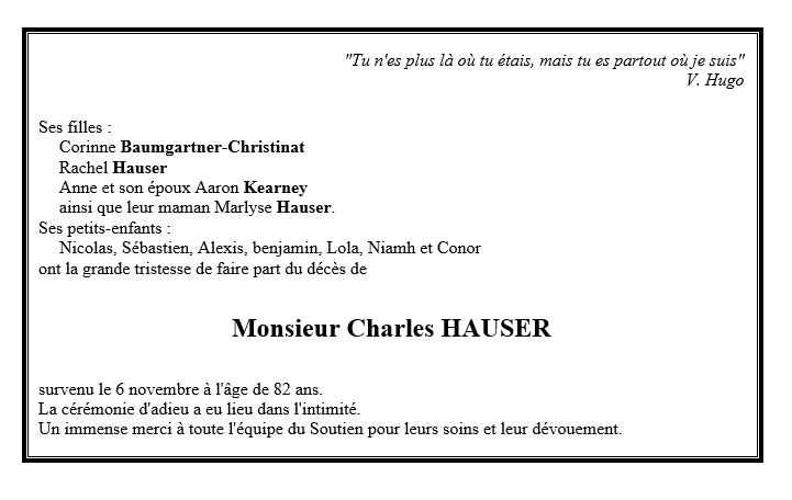 Monsieur Charles HAUSER 01 juin. 1939 - 06 nov. 2021 Avis mortuaire PFG Télecharger PDF Partager sur: Galerie PreviousNext PreviousNext