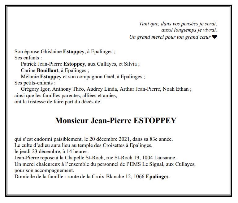 Monsieur Jean-Pierre ESTOPPEY 16 aoû. 1939 - 20 déc. 2021 Avis mortuaire PFG Télecharger PDF Partager sur: Galerie PreviousNext PreviousNext