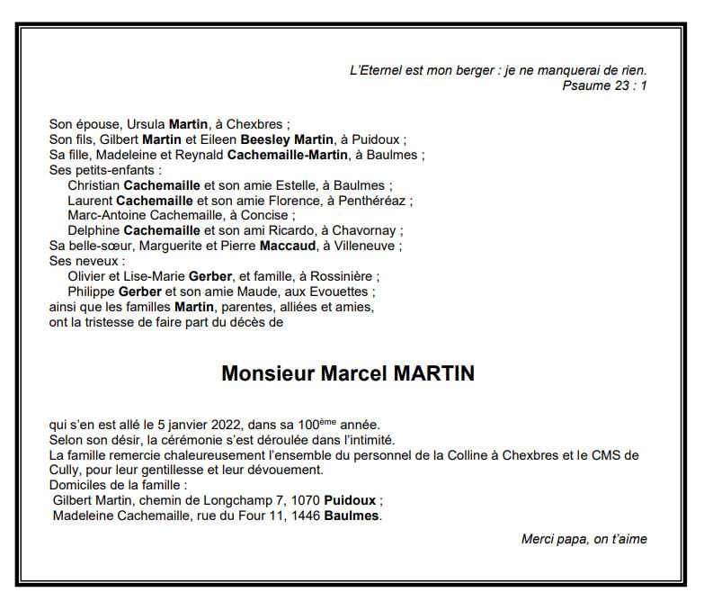 Monsieur Marcel MARTIN 23 aoû. 1922 - 05 jan. 2022 Avis mortuaire PFG Télecharger PDF Partager sur: Galerie PreviousNext PreviousNext